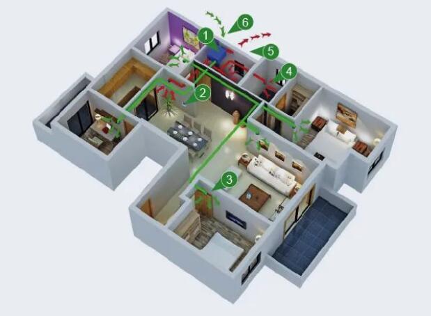 在次區(qū)域,即餐廳、過道、衛(wèi)生區(qū)域、廚房等污染相對嚴(yán)重的地方,安裝排風(fēng)口或廚房專用排風(fēng)口,VIVA'O HEP機組為家人排出污染空氣 ,完美實現(xiàn)清新空氣的持續(xù)循環(huán)。