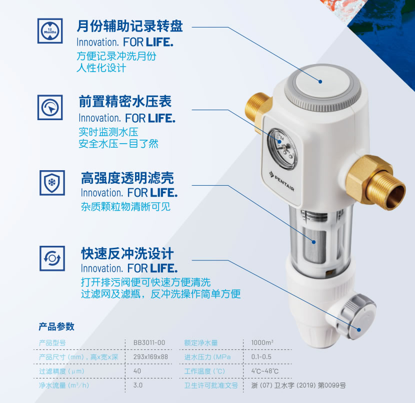 前置過濾是入戶第一道屏障,大家一定都聽過,濱特爾反沖式前置過濾,采用316不銹鋼網,雙網加持;反沖式沖洗,360°旋刮,雙重清潔保障。