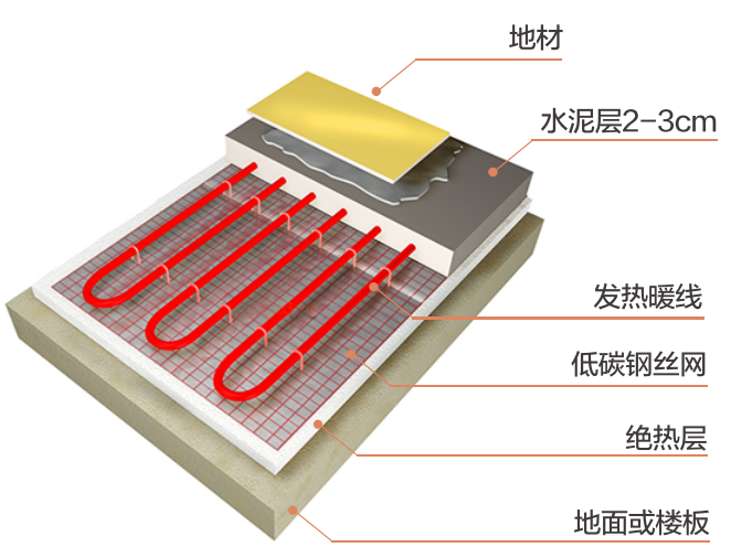 是以溫度不高于60℃的熱水埋置于地面以下填充層中的加熱管內循環流動,