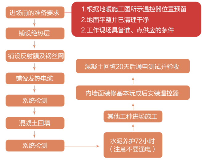 地暖進場前的要求(裝潢公司的冷熱水、強弱電必須完全結束并通過業主的驗收,衛生間防水要刷好,地面平整度需要按要求做好,線管如何走等);在現場大家可一起溝通一下施工的進度,地暖的進度是按照裝潢的節點來的,裝潢做好一步,地暖才可以跟進一步,是無法確定具體時間的,基本上是裝潢的一步做好了,再提前幾天通知暖通公司做下一步,但是交底時暖通公司需要把各個