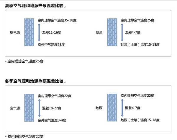 地源熱泵是利用地球表面淺層水源(如地下水、河流和湖泊)和土壤源中吸收的太陽能和地熱能,并采用熱泵原理,既可供熱又可制冷的高效節(jié)能空調(diào)系統(tǒng)。相對于普通空調(diào)(空氣源熱泵)而言,地源熱泵是一種新技術,簡單地說即將普通空調(diào)的換熱源改到土壤或自然水中,也就是夏天將室內(nèi)的熱量送到土壤或自然水中,而冬天從土壤或自然水中提取熱量到室內(nèi)。土壤或自然水的溫度無論冬夏恒定在15-20℃左右,而空氣溫度因冬夏或白天夜晚變化很大,從2-40℃左右,換熱源溫差很大,導致COP值波動很大,能耗極高甚至無法工作。