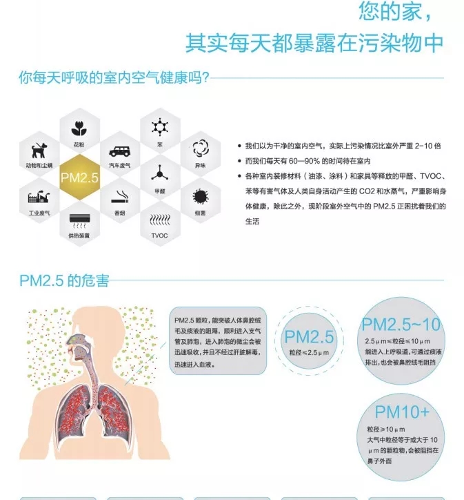 愛迪士新風提供的新風系統是有效應對空氣污染,提升居家生活健康水平的利器。據有關調查顯示,現代人有平均60%~90%的時間在室內。可想而知,如此長時間待在室內環境里,良好的室內空氣品質對個人健康顯得多么重要。而為了打造良好的室內空氣環境,應對室外空氣污染對室內空氣的侵襲,以及室內設施帶來的空氣污染,如PM2.5、甲醛、苯、TVOC以及室內塵螨、細菌等,便需要用新風系統把受污染的空氣進行過濾、凈化,最終轉換成新鮮健康的空氣。