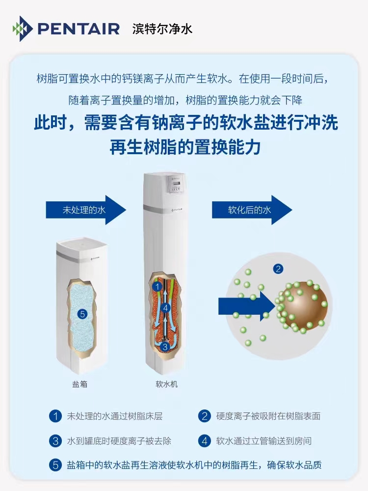家用軟化水設(shè)備是應(yīng)用離子交換技術(shù),通過樹脂上的鈉離子與水中的鈣、鎂離子進(jìn)行交換,從而吸附水中多余的鈣、鎂離子,達(dá)到去除水垢(碳酸鈣或碳酸鎂)的目的。
