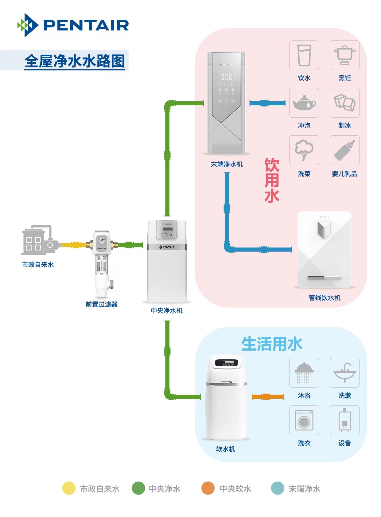 全屋凈水一般分為四步,包括:前置過濾、中央凈水器、中央軟水器、廚下直飲。若再加一個就是管線機