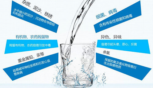 通常飲用水最主要的問(wèn)題就是消毒用的余氯、有機(jī)化合物和重金屬幾大污染物質(zhì)。這些污染物質(zhì)的危害在于我們的身體無(wú)法將其分解或排泄掉,因此會(huì)隨著時(shí)間的推移在我們的身體里不斷的積累,最終對(duì)我們的身體造成無(wú)法逆轉(zhuǎn)的破壞。